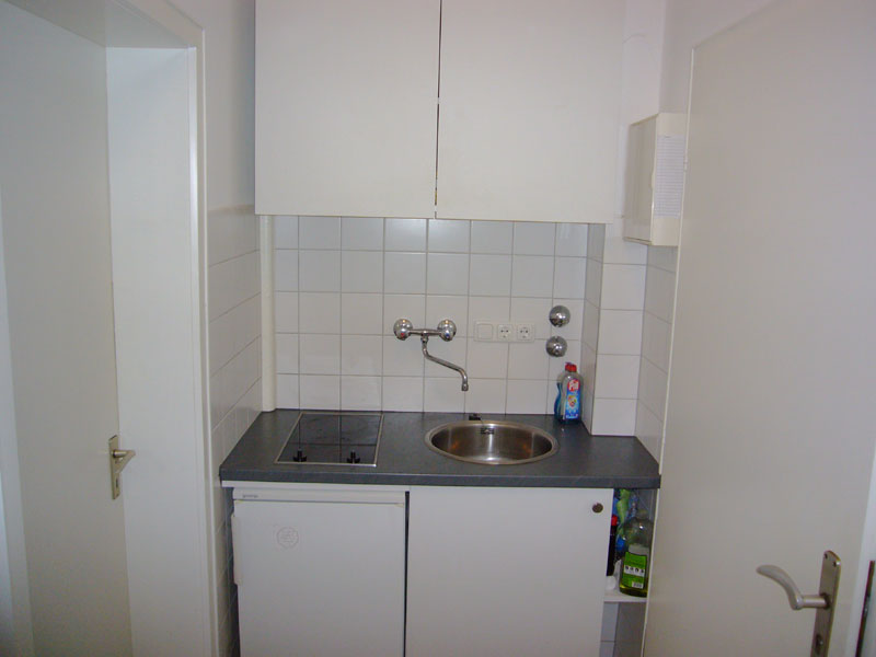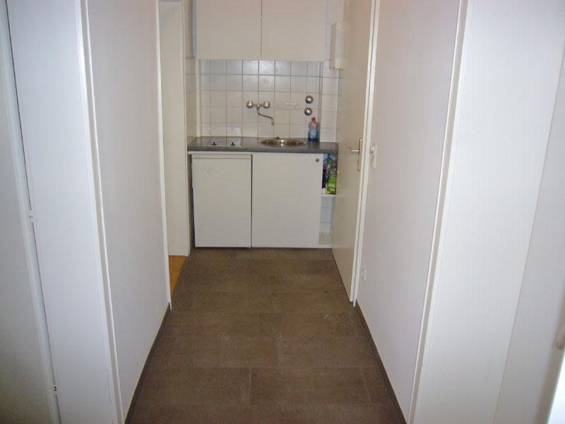 • neue, kleine Küchenzeile mit Kühlschrank, Cerankochfeld, Spüle, Hänge und Unterbauschränken im Flur zur gemeinsamen Nutzung mit den beiden anderen Mietern