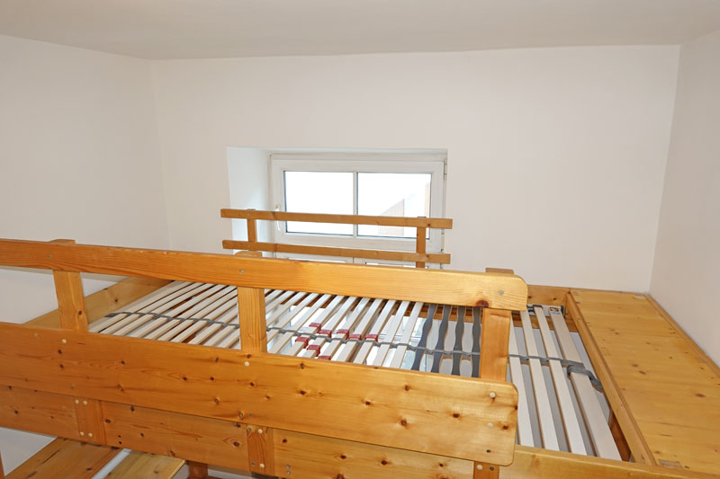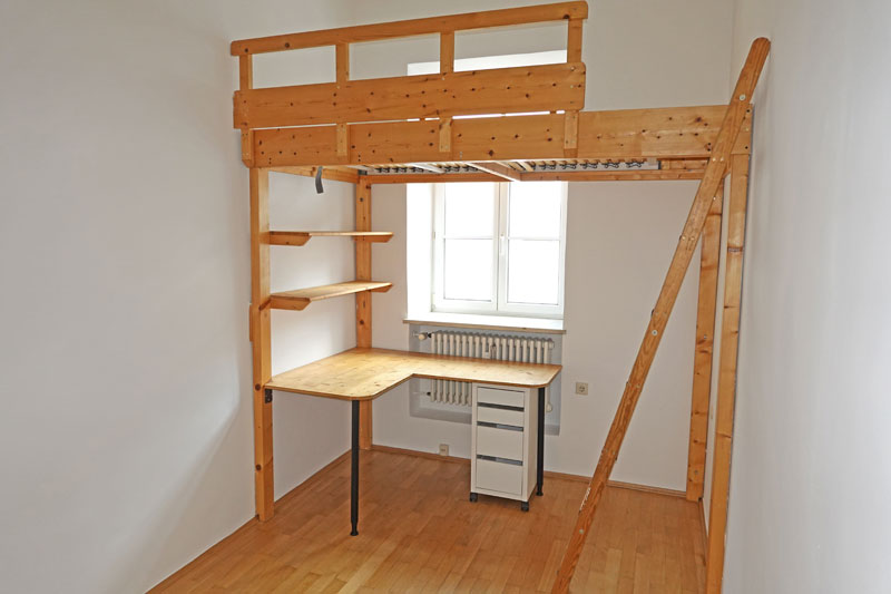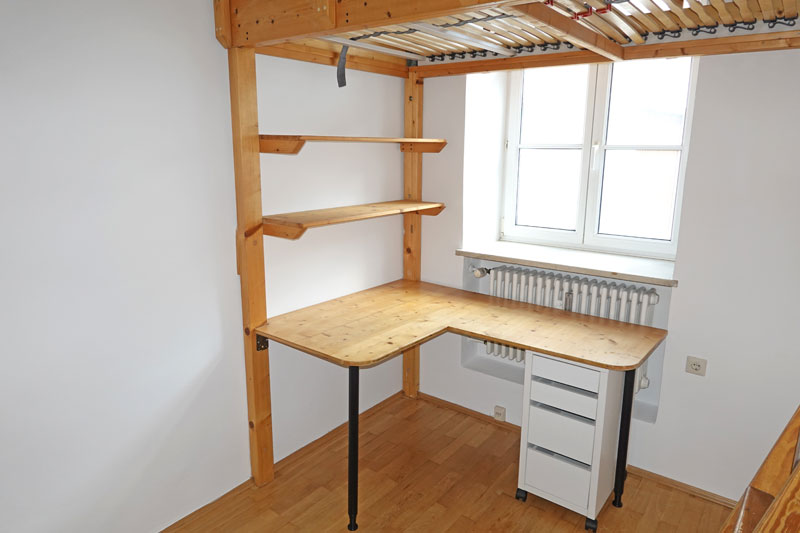 • im Zimmer ist bereits ein Galerieelement mit Hochbett, Schreibtisch und Regalen eingebaut, zusätzlich gibt es einen Bürostuhl