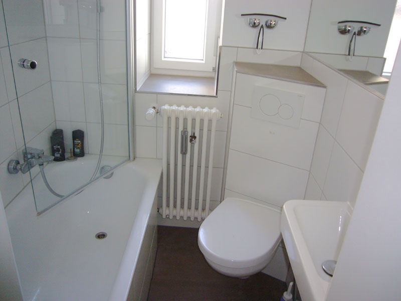 • modernes Bad mit Badewanne, Handwaschbecken und WC zur gemeinsamen Nutzung mit den beiden anderen Mietern