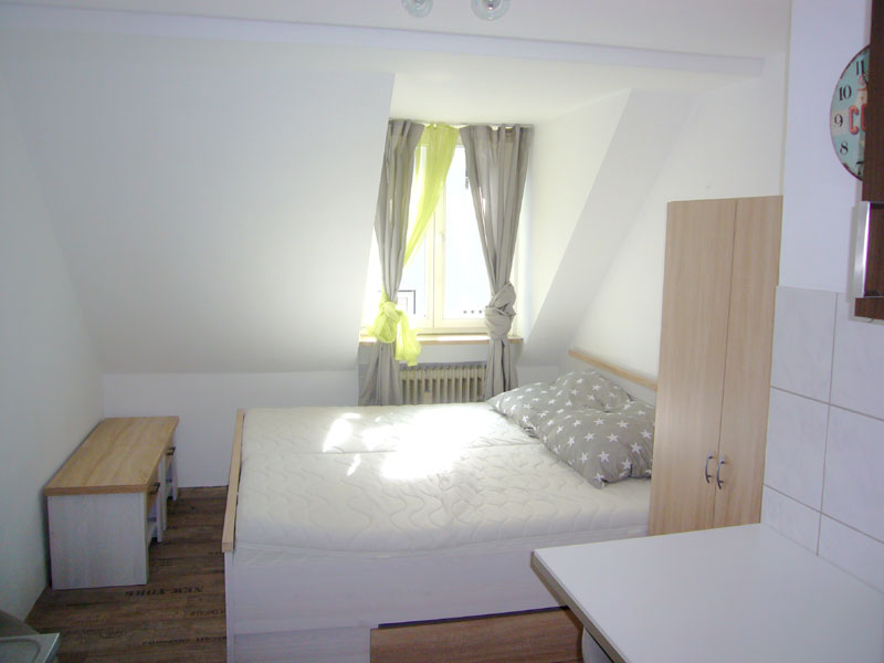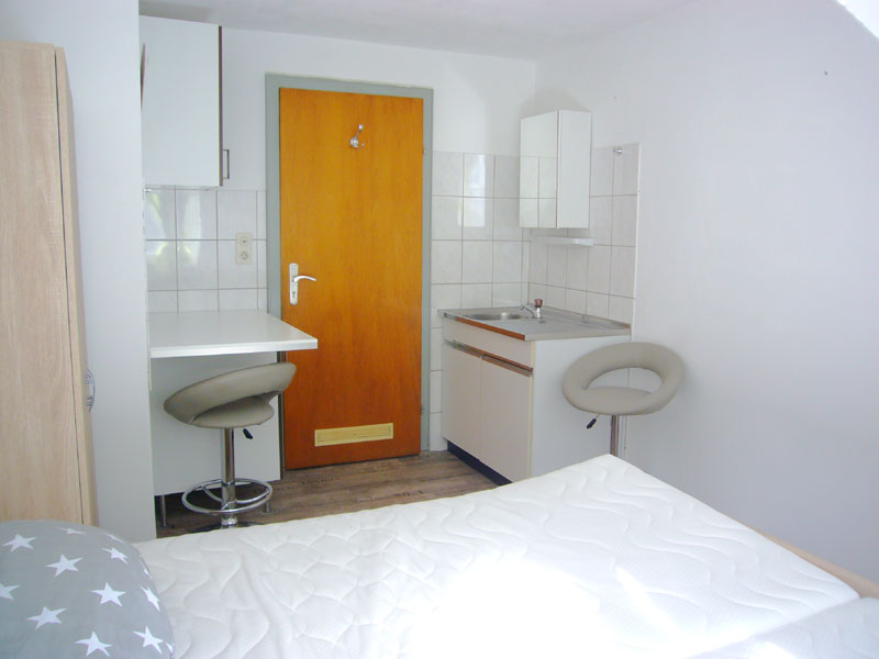 • Das Zimmer ist mit großem Bett, Kleiderschrank, Sideboard. Hochtisch mit zwei Hockern, Geschirrschrank, Spüle mit Unterschrank, Spiegelschrank, Vorhängen und Deckenlampe komplett möbliert.